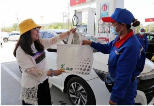 圖為中國(guó)石化青海石油分公司的加油站員工向客戶贈(zèng)送環(huán)保購(gòu)物袋
